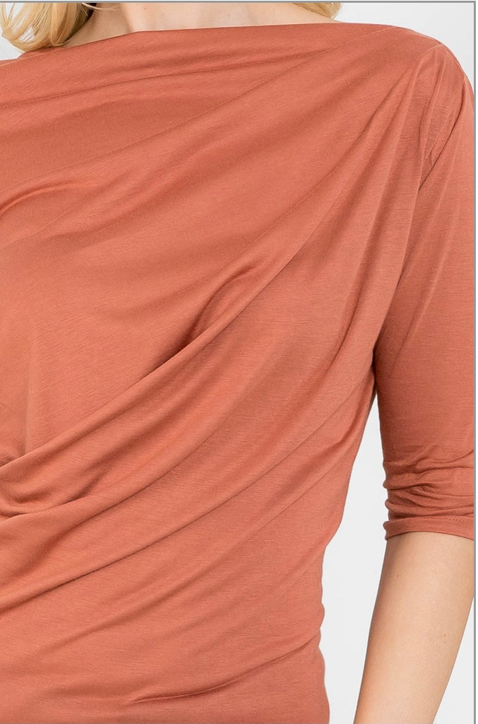 Sometimes simple goes a long way. Loving how a neckline can change a design of something simple and add elegance. This top is a classic example. Simple, lightweight, pretty brick color, raglan quarter length sleeves, and an asymmetrical neckline that allows to dress up or down. This top is fitted so I sized up. I’m 5’6 with 34” bust line and wear a medium. Perfect length! 65% rayon 35% polyester