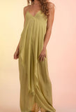 Elevate your wardrobe and stand out with this unique flawless maxi dress. Dress up or down for an elegant look that will not disappoint. Fabulous soft avacado green, V neck, spaghetti straps, ankle length, flowy, deep V elastic back with drape detail, elegant light crape feel fabric, forgiving fit. Runs TTS; Model is 5’9 128 lbs. 34” bust line 27” waist wearing a small. •100% Rayon