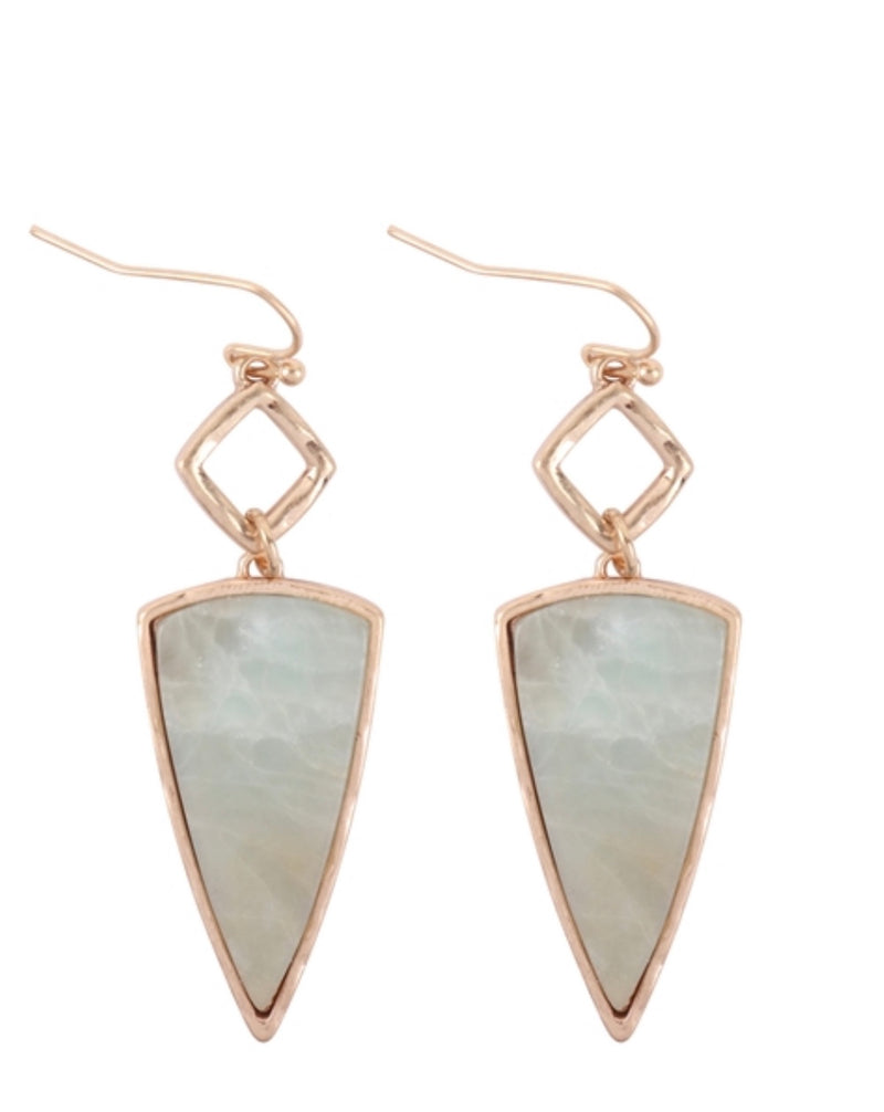 These earrings are all about natural beauty at its finest. Semi precious arrow head design with an Amazonite natural stone, matte gold finish, fish hook drop dangling earrings. Lightweight 3” length