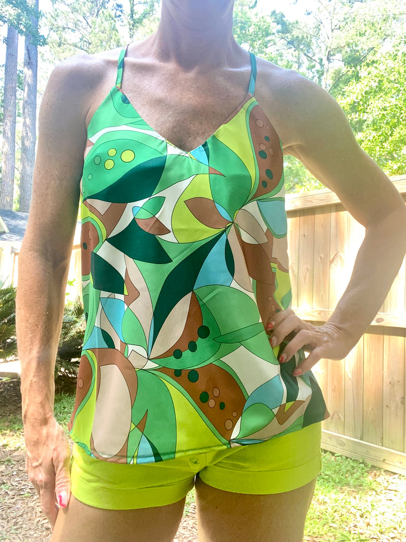 Bright vibrant colors and cool tops make summer fashion a breeze. This top has a high end feel and creates such a refreshing look. Beautiful hues of greens, abstract leaf patterns, silky, lightweight, racer back, v neckline, airy and cool,...
