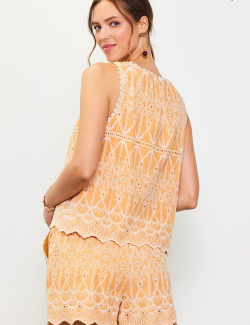 Elevate your style with this gorgeous embroidered sleeveless top. It boosts a high end feel and a fabulous look. Pretty butterscotch color, white embroidery with a scalloped trim along the neckline, sleeves and bottom. This top has a button back...