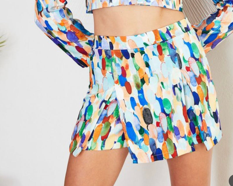 If you want color and a pair of shorts that can be dressed up or down and easy to style then these skort shorts are just for you. These have an artsy vibe full of color, art spotted pattern, elastic...