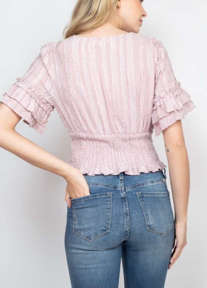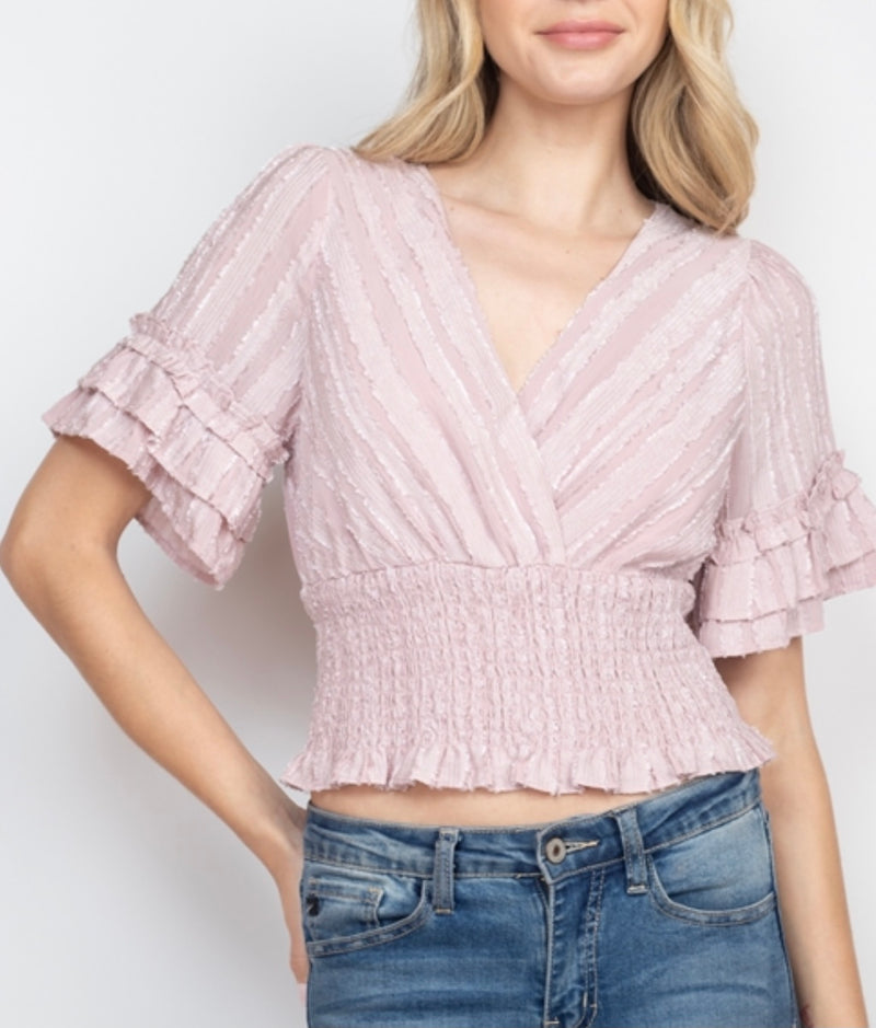 This one is a must see in person to appreciate its detail and sophistication. Pretty shimmery dusty pink color with a vintage unfinished detail pattern, v neck, smock waist, with ruffle trim and sleeves. Fits to the waist and looks...