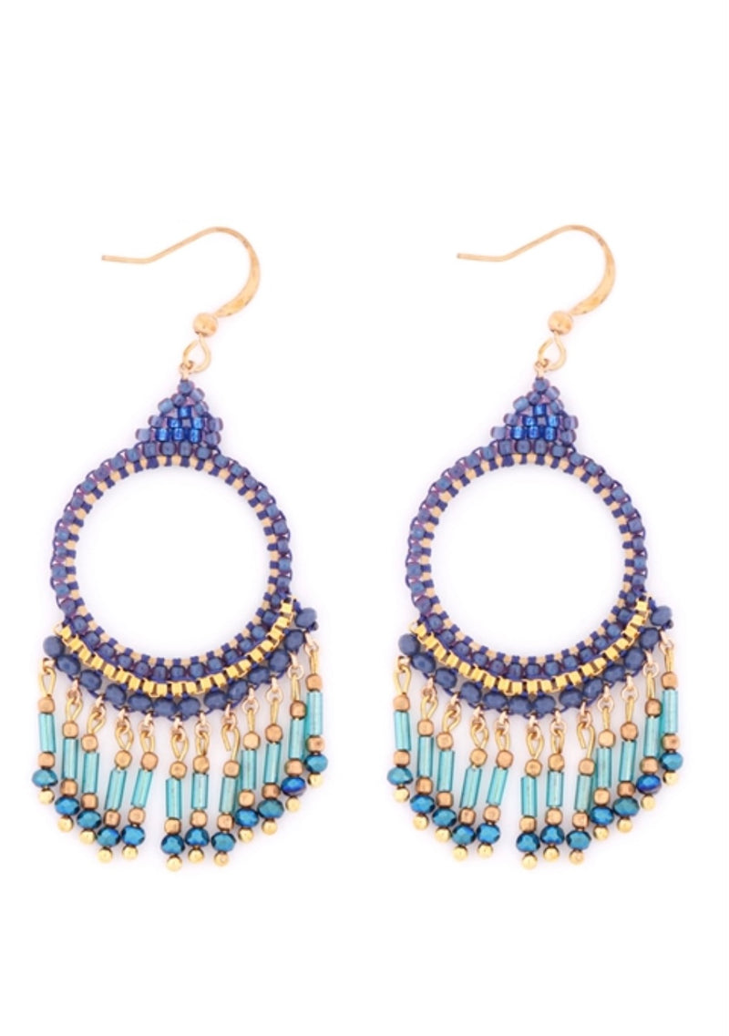 You can not go wrong with these statement bohemian style earrings. Pretty shades of blue beads, hanging, lightweight and are 2”length.