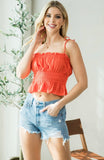 So much to say about this cute and flirty crop top. It’s a pretty orange color with smock detail, spaghetti tie straps, gathered in the chest area, fitted, ruffle bottom with slightly ruffle trim at the top, and belly button length. Runs tts with limited room, can size up! Jacelle is 5’6 34C chest wearing a medium. 100% Rayon
