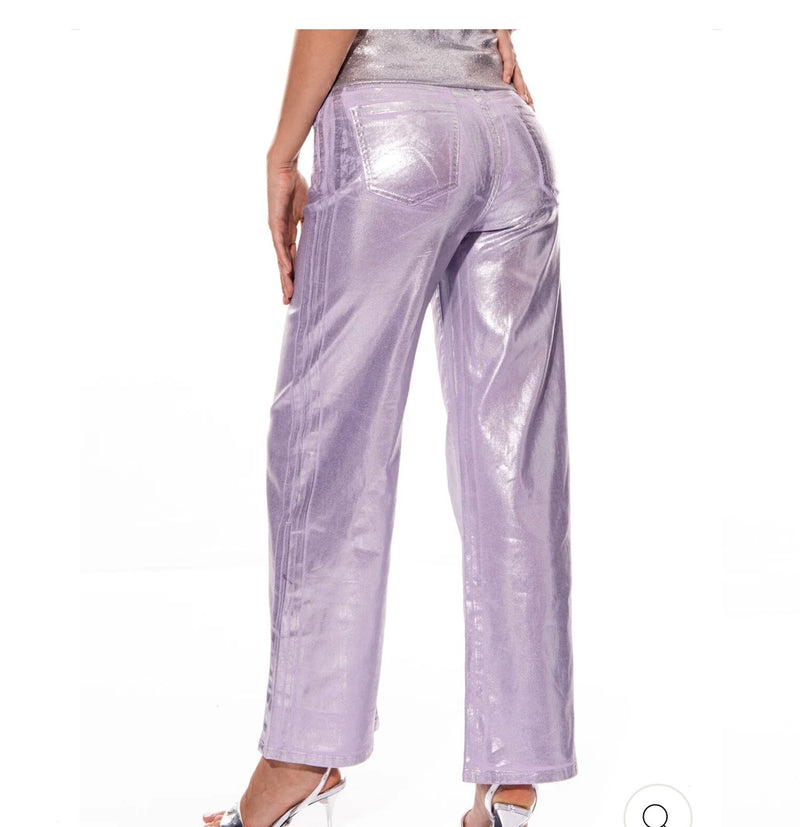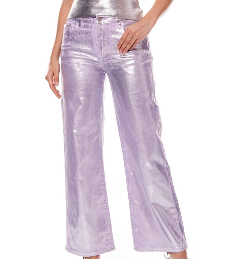 These Lavender Metallic Wide Leg Jeans add an on-trend twist to your wardrobe. Made with a metallic finish and a wide leg design, they are perfect for making a statement. These jeans have a zip up button closure and consist...