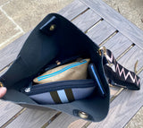 This bag is where fashionable meets functional. We called it pocket tote because this tote is all about pockets. 2 large pockets on the front and back as well as the sides to keep everything organized and easy to find. Very soft vegan leather with unfinished interior. A small zip credit card wallet included. Also includes a trendy guitar strap that’s adjustable to wear as a crossbody.