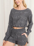 Lounge in style with this easy comfy too piece washed charcoal short set.  Top is long sleeve with smock trim, scoop neck, cropped, blousy fit.  Shorts are matching with smock waist with decorative tie, front pockets, athletic fit, 2” inseam. Runs TTS; model is 5’8 wearing small.  65% polyester 25% rayon 10% nylon