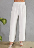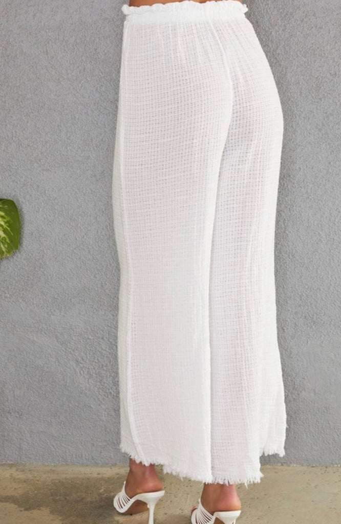 Every girl needs a pair of white linen pants to have around for summer. It’s a timeless classic that’s so elegant and pairs well with any top. Classic, chic and elegant is what these pants are all about. Elastic tie waistband, wide leg, raw hem, basket weave detail, great length, airy and cool. Perfect to wear over swimsuit for a stroll on the beach. Runs true to size; Model is 5’7” 127 lbs. 26” waist wearing a small.