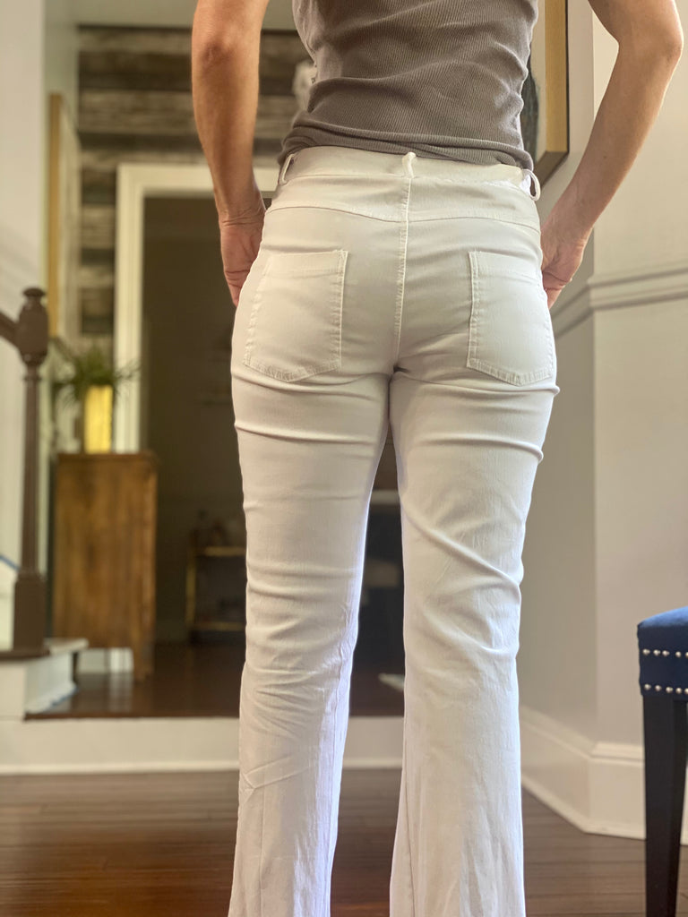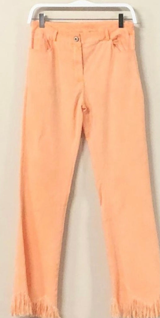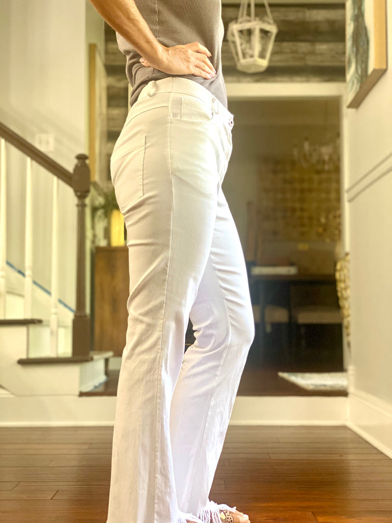 White jeans are a must have and adds class to the denim world. These stretch jeans are so comfy and have such an easy fit. White lightweight stretch fabric, fringe hem, button/zip closure, front and rear pockets, great length, slightly flare bottom, high waist. Pair with your favorite top or sweater! Runs TTS; Jacelle is 5’6 27” waist 34” hips wearing small. The length is a perfect fit. 95% Cotton 5% Elastic. XS/ 0-2, Sm/ 3-4, Med./ 5-6, Lg./ 8-10 Made in Italy Now available in Mineral Washed Orange!