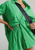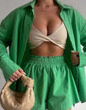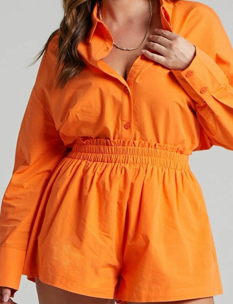 When talking about ease, comfort, versatility and more these sets are just what you need. Pair as a set or wear separately with individual pieces. Never gets old with using as a swimsuit cover up as well.   The styles are endless and your creativity can come alive with these matching long sleeve button down short sets. Vibrant orange or lively green, tops are button down, collar, dress shirt like style, lightweight, cool, and can be worn open, tied as a crop top or simply buttoned. The shorts are matching material, forgiving fit, elastic waist, airy and cool with a 2” inseam.  Runs TTS; model us 5’7” 127lbs. 26” waist wearing a small.           •100% Cotton
