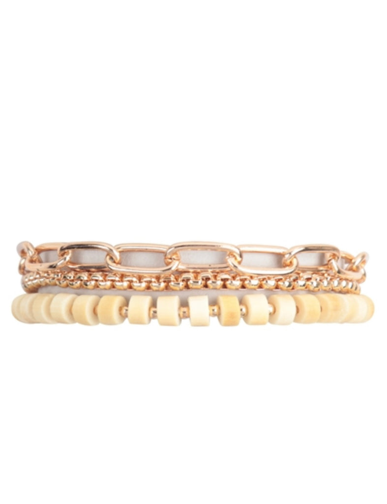 These bracelet’s are simple and chic. A cross between wood beads and a chain link layered look. A very simple way to add to an outfit that’s made for everyday wear. Three strand bracelets with one claw adjustable hook.