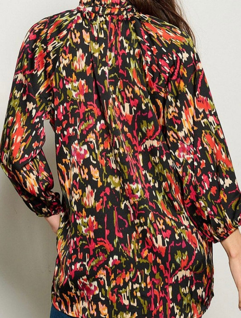 Take this one into spring and summer! Bright, bold and fun says it all in this button down top. This one heightens the mood and raises the bar on fashion. Exquisite color mix, colored splatter pattern, button down, shirred lantern...