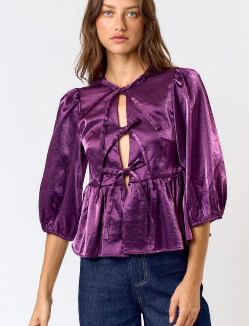Transform your style with our Eggplant Metallic Peplum Top! The chic puffy sleeves exude confidence while the self-tie front adds a touch of playfulness. Rock this bold top and stand out from the crowd. Go ahead, take a fashion risk...