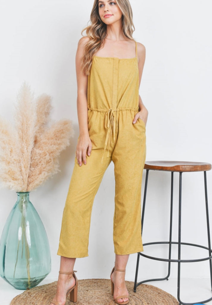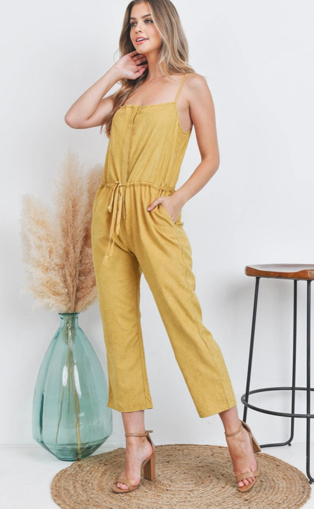 Jumpsuits are an easy and effortless  way to make styling easy.  From sneakers to heels it’s a way to go from day to night without any hassle.  This cute stylish jumpsuit is a pretty moss green with adjustable spaghetti straps, drawstring waist, functional top buttons, soft suede like fabric, loose fit, side pockets and above ankle length. Runs TTS; Model is 5’7” wearing small. 100% polyester