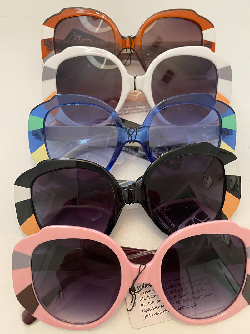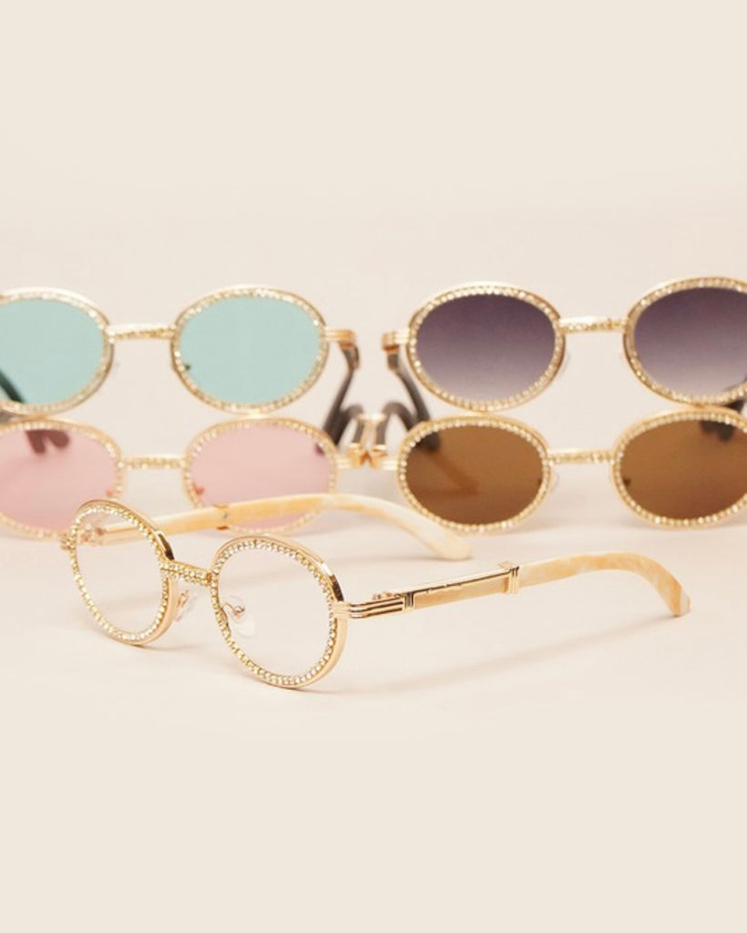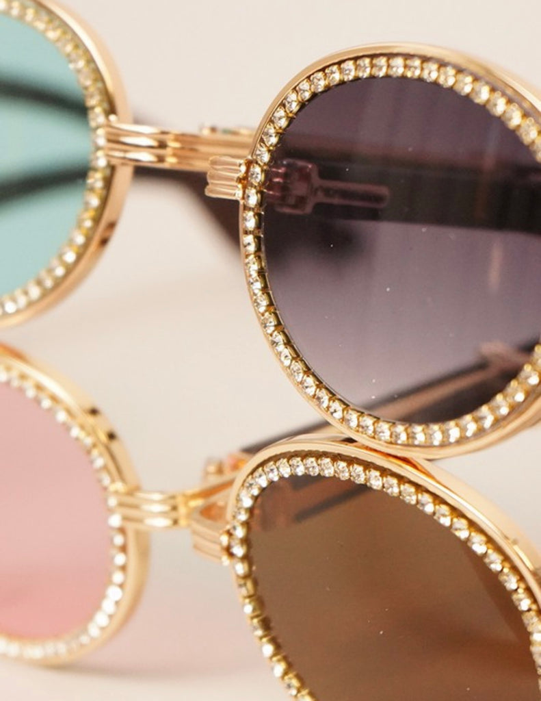 Stand out and sparkle this season with these ultra glam rhinestone sunglasses.  It’s a blend of 60’s style with a touch of a new age vibe.  These are round trimmed in rhinestones with gold trim and assorted lens color. 5”x2” one size fits all! Uv400 protection again ultra violet rays uva and uvb.
